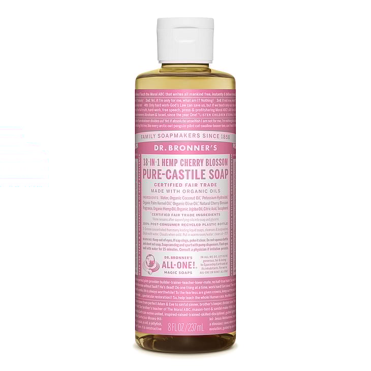 Dr. Bronner'sin 18-in-1 Castile nestemäinen saippua, Kirsikankukka, on vegaani ja monikäyttöinen saippua, joka on valmistettu luonnollisista orgaanisista kookos, oliivi, palmun siemen ja jojoba öljyistä. Orgaaniset öljyt yhdessä aitojen eteeristen öljyjen kanssa muodostavat ainutlaatuisen saippuan, joka puhdistaa tehokkaasti ilman hankausta muodostaen samettisen vaahdon ja jättäen ihon silkinpehmeäksi ja raikkaaksi. Tätä monikäyttöistä saippuaa voit käyttää niin kasvoille, käsille, koko vartalolle kuin hiuksillekin. Lisäksi sitä voi käyttää myös laimennettuna esim. kodin puhdistukseen, lattioihin, työpisteisiin ja tiskiaineena. Dr Bronner's on perheyritys, joka on valmistanut saippuaa jo useamman sukupolven ajan. Sarja on rakastettu, koska sen tuotteet ovat todella toimivia ja ympäristöystävällisiä. Saippua on biohajoava ja pakkaus 100% kierrätettävä pullo, jonka voi kierrättää aina uudelleen. Castile Liquid Soap nestemäinen saippua sisältää aitoja eteerisiä öljyjä, jotka mahdollistavat raikkaat tuoksut, mutta sitä on saatavilla myös tuoksuttomana ja tupla oliiviöljyllä (Baby-Mild Unscented). Mikä näistä on sinun suosikkisi?