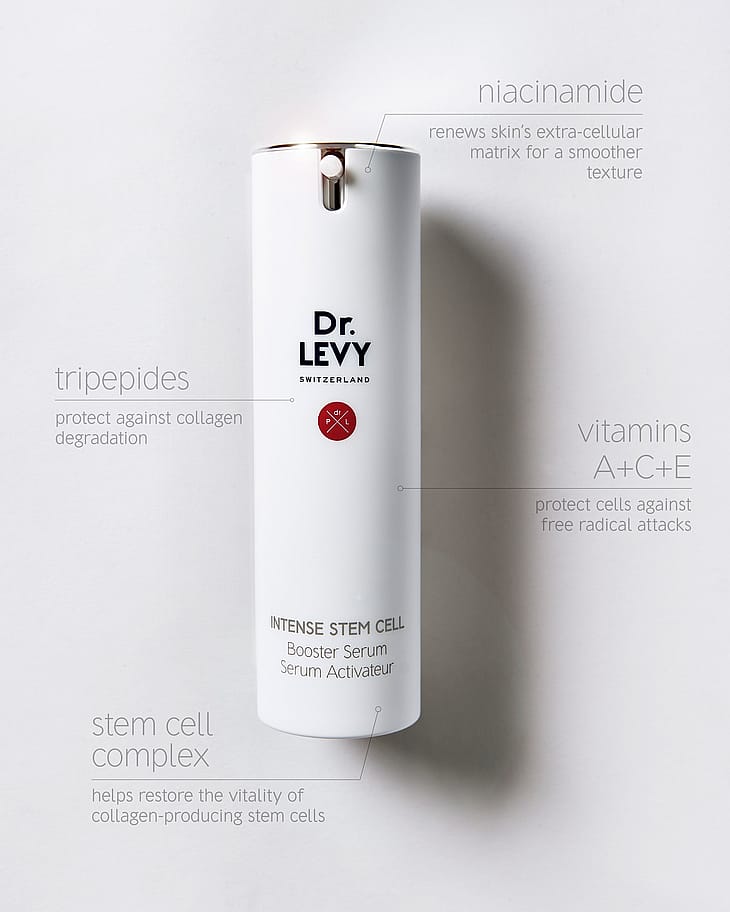 Booster Serum on Dr. LEVY Switzerland -merkin palkittu ja myydyin seerumi. Sisältää Dr. Levyn patentoitua kantasoluyhdistettä, joka stimuloi tehokkaasti kollageenin ja elastiinin tuotantoa, mikä vähentää näkyvästi juonteita ja ryppyjä ja parantaa samalla ihon kiinteyttä. Tuotteessa on lisäksi paljon vitamiineja, omegarasvahappoja, niasiiniamidia ja hyaluronihappoa, jotka auttavat korjaamaan ja tasaamaan ihon tekstuuria. Koostumus on todella kevyt ja nopeasti imeytyvä. Tehokas seerumi, joka uudistaa ihoa. Sisältää Dr. Levyn patentoitua kantasoluyhdistettä. Kiinteyttää ja minimoi juonteita.