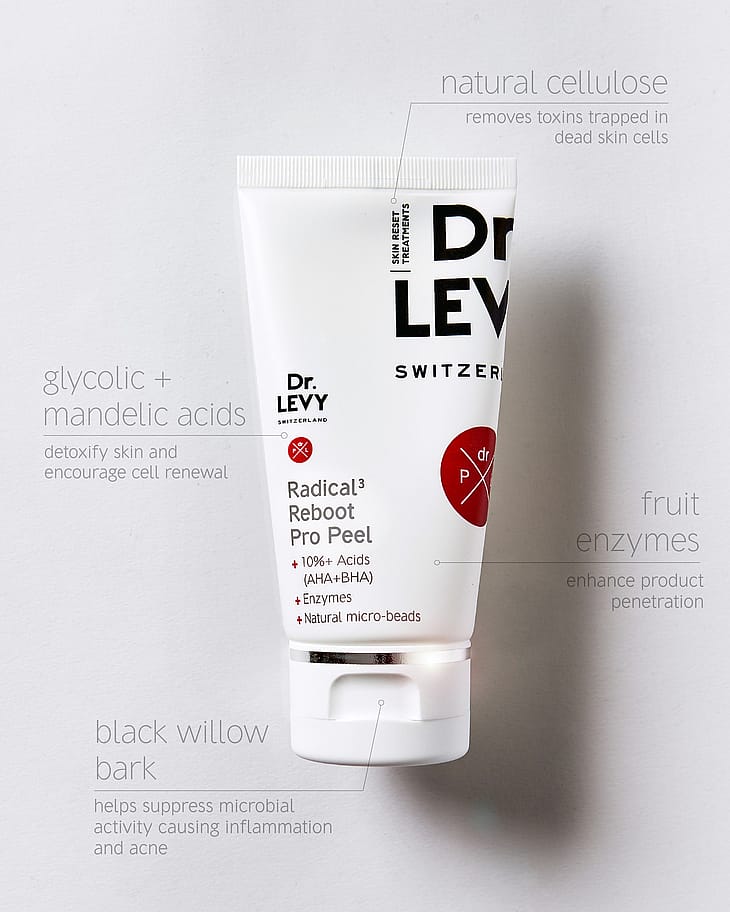 Radical3 Reboot Pro Peel on monipuolinen kuorinta, joka sekä kuorii että toimii uudistavana kasvonaamiona, joka syväpuhdistaa ja pehmentää ihoa. Sisältää AHA- ja BHA-happoja, granaattiomenaentsyymejä ja luontaisia ja biologisesti hajoavia pieniä selluloosahelmiä. Koostumus auttaa tasaamaan ihon tekstuuria samanaikaisesti kun se tukee ihon happovaippaa probiootein ja kosteuttaa ja rauhoittaa hyaluronihapon, B5-vitamiinin ja aloe veran avulla. Kuorinta ja uudistava kasvonaamio. Syväpuhdistaa ja pehmentää. Sisältää happoja, probiootteja ja aloe veraa.