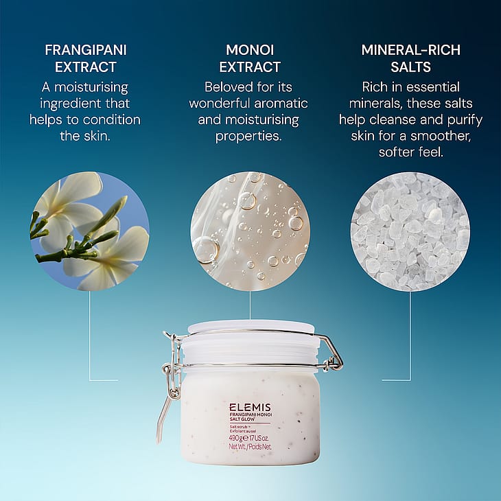 Ylellinen suolakuorintatuote, joka sulaa kosketuksissa ihoon. Irrottaa kuolleita ihosoluja ja palauttaa ihon hehkua. Kosteuttaa ja ravitsee. Mineraalipitoiset suolat yhdessä hibiskuksen kanssa puhdistavat ja kuorivat. Tahitilainen monoiöljy ja frangipanikukat saavat ihon tuoksumaan hyvältä. Iho on käsittelyn jälkeen silkinsileä. Mineraalipitoiset öljyt ja hibiskus puhdistavat ja kuorivat. Ravitseva kookospähkinäöljy säilyttää ihon kosteuden. Hyvältä tuoksuva tahitilainen monoiöljy ja frangipani.