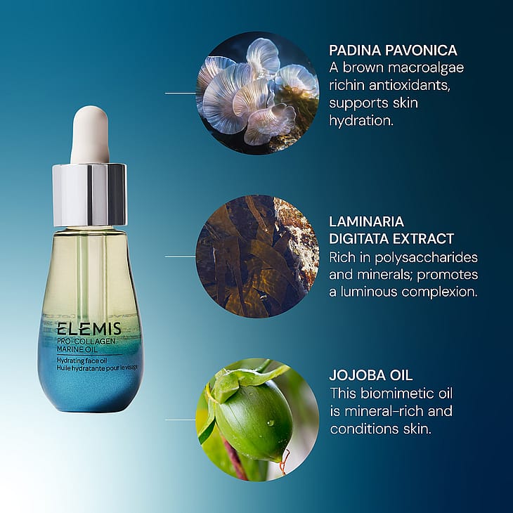 Pro-Collagen Marine Oil on mineraalipitoinen konsentroitu kasvoöljy kaikille ihotyypeille. Sisältää kolmenlaista levää: Padina Pavonica, kultalevä ja merilevä. Kosteuttavat ihoa intensiivisesti ja häivyttävät juonteita ja ryppyjä. Unikonsiemenöljy antaa iholle hohtavaa heleyttä. Öljy auttaa tukemaan ihon kosteutta ylläpitävää suojakerrosta, mikä puolestaan tekee ihosta vastustuskykyisemmän ja vähentää ihon punoitusta. Heleyttävä ja pehmittävä kasvoöljy. Sopii kaikille ihotyypeille, mutta erityisesti kuivalle iholle. Vähentää näkyvästi hienoja juonteita ja ryppyjä.