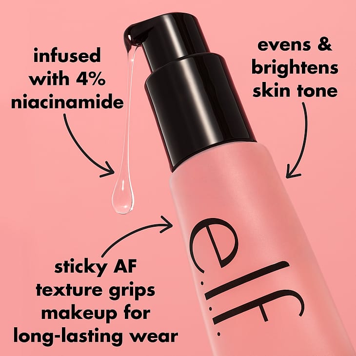Geelipohjainen meikinpohjustaja, joka sisältää 4 % niasiiniamidia, joka tasoittaa ihon sävyä ja kirkastaa samalla kun se kiinnittää meikin.