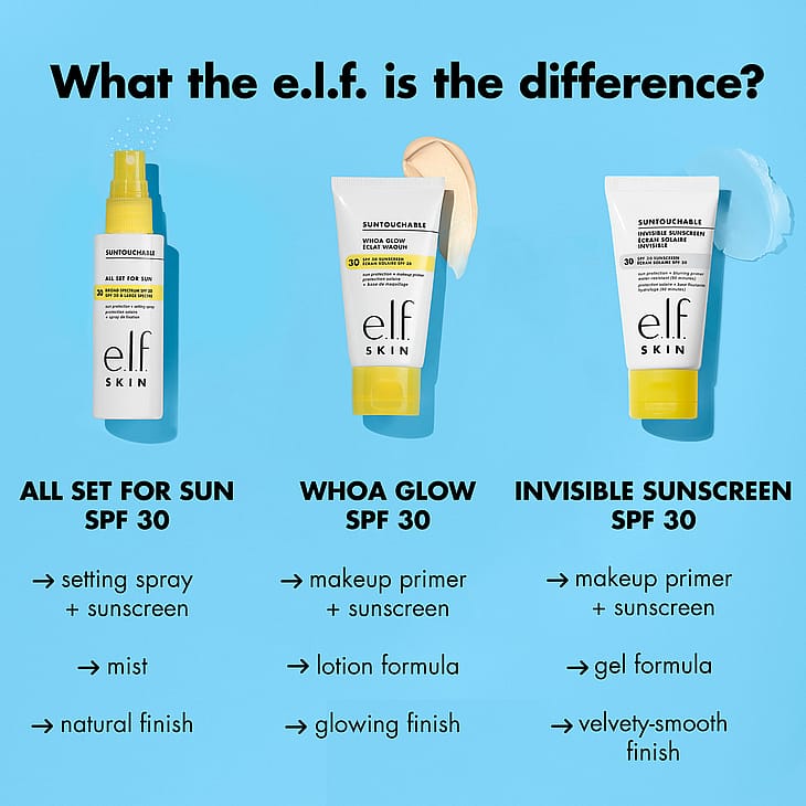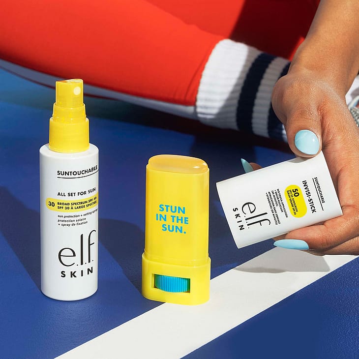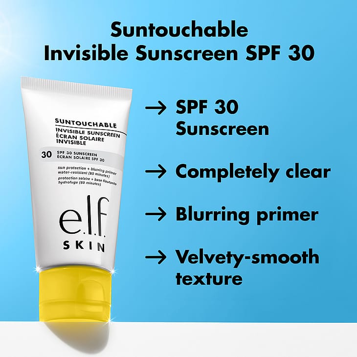e.l.f. Cosmetics Suntouchable Invisi-Stick SPF 50 on aurinkovoide, jota haluat käyttää jatkuvasti! Tämä kätevä aurinkotikku tarjoaa UVA- ja UVB-aurinkosuojaa SPF 50 kevyellä koostumuksella, joka levittyy täysin läpinäkyvästi kaikille ihonsävyille ja antaa luonnollisen lopputuloksen (ei valkoisia laikkuja!). Se sisältää myös kosteuttavaa auringonkukansiemenöljyä ja rauhoittavaa bisabololia. Koska se ei ole rasvainen, voit levittää sitä uudelleen meikin päälle ja alle koko päivän ajan."