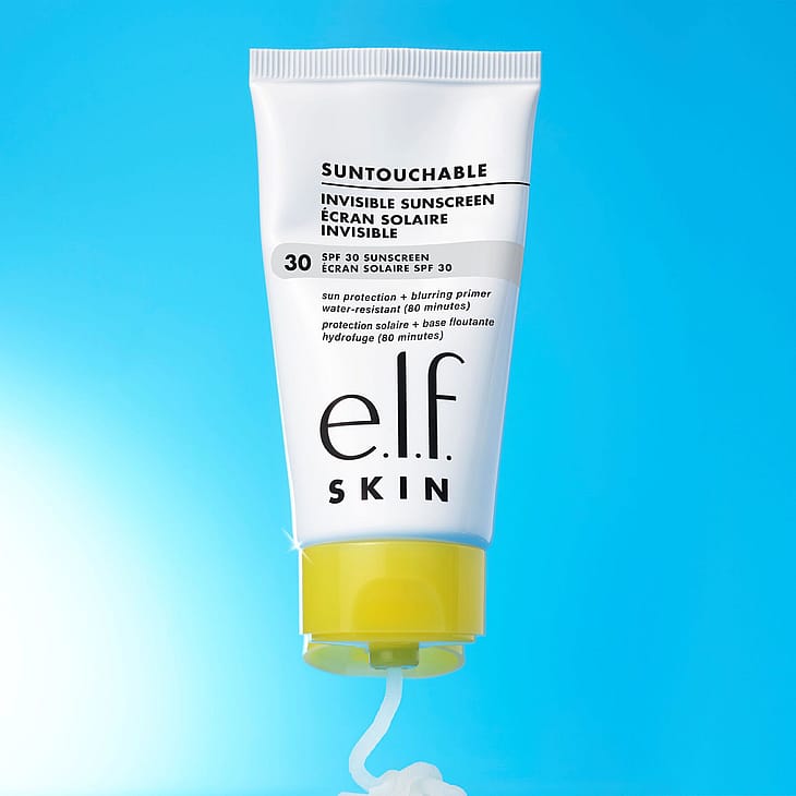 Selkeä valinta aurinkosuojaksi on e.l.f.:n SKIN's Suntouchable! Invisible SPF 30. Tämä puhdas, kevyt geelimäinen aurinkovoide tarjoaa näkymättömän, laajakirjoisen aurinkosuojakertoimen 35, ei jätä valkoisia jälkiä ja sopii kaikille ihonsävyille. Rasvaton geelikoostumus toimii myös kasvojen pohjustustuotteena, joka tasoittaa ja kiinnittää meikin pitkäksi aikaa. Lisäksi koostumus sisältää aloe veraa ja valkohilpan siemenöljyä.