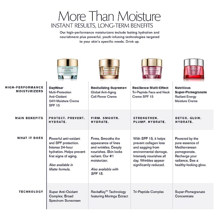 Sisältää edistyksellisen Tri-Peptide-ainesosayhdistelmän, joka lisää ihon luonnollista kollageenituotantoa tehden ihosta sileämmän tuntuisen ja näköisen. Suojakertoimen 15 ja antioksidantteja sisältävä koostumus auttaa vastustamaan ympäristön aiheuttamaa kollageenin hajoamista ja ihon veltostumista. Näin iho säilyttää luonnollisen kiinteytensä ja sävynsä. Antaa runsaasti kosteutta, joka kestää koko päivän tehden ihosta täyteläisemmän ja hehkuvamman näköisen.