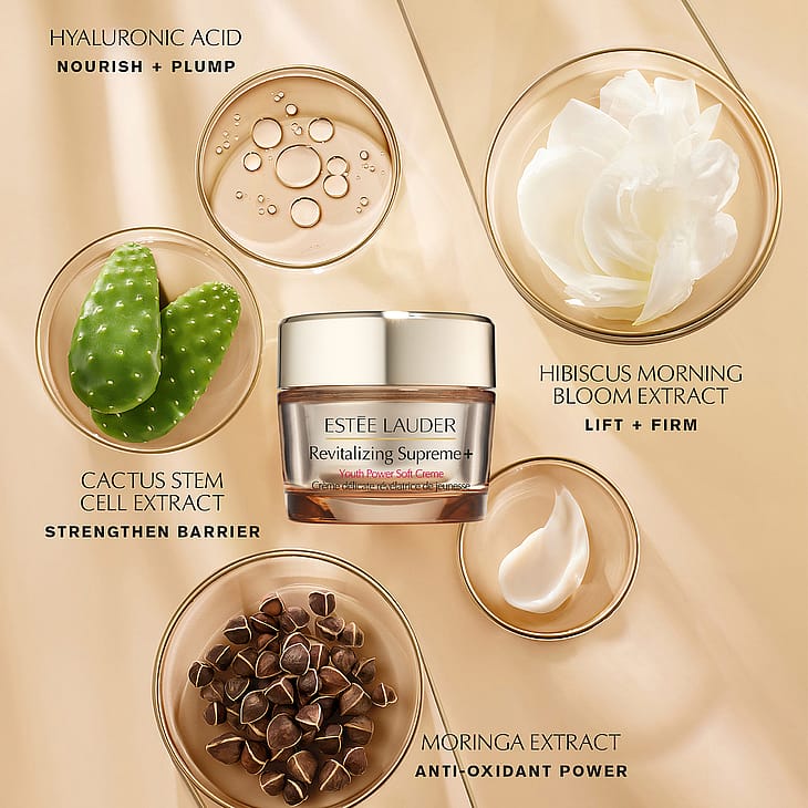 Revitalizing Supreme+ Youth Power Soft Cream on ylellinen kasvovoide, joka on rikastettu voimakkailla anti-aging-aineosilla, kuten moringauute ja hibiskuksen aamukukka, jotka edistävät ihon luonnollista solujen uusiutumista ja parantavat ihon ulkonäköä. Lisäksi siinä on kaktusten solu-uutetta ja hyaluronihappoa, jotka pitävät ihon kosteutettuna jopa 72 tuntia ja parantavat ihon rakennetta. Estée Lauderin Revitalizing Supreme+ Youth Power Soft Cream auttaa sinua saamaan kiinteämmän ja säteilevämmän ihon.