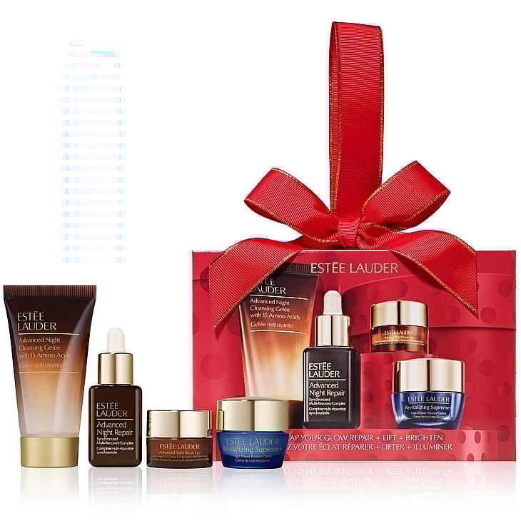 Unwrap Your Glow Rescue + Reset + Repair Starter Set sisältää puhdistusgeelée, seerumin, silmänympärysvoiteen ja yövoiteen.