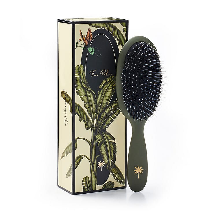 Fan Palms Blush -harjassa on villisian- ja nailonharjakset, jotka tuovat hiuksiin kiiltoa ja sileyttä. Nailonharjakset ovat pidemmät, jotta ne voivat hellävaraisesti stimuloida hiuspohjaa ja selvittää hiukset, kun taas villisianharjakset auttavat levittämään talia. Harja stimuloi verenkiertoa hiustuppeihin, ja useimmat huomaavat voivansa vähentää hiustenpesun tiheyttä joka kolmanteen tai neljänteen päivään. Toimitetaan kauniissa laatikossa, jossa on kultaisia yksityiskohtia.