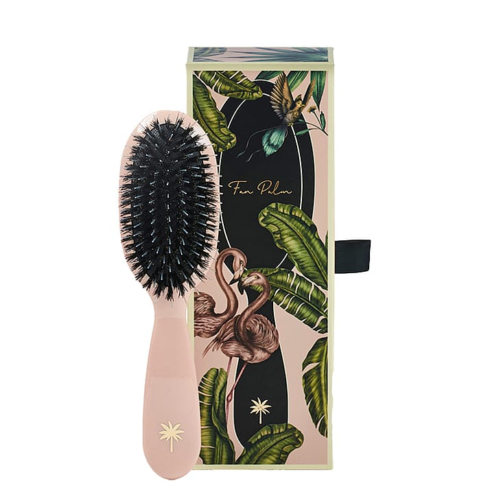 Fan Palms Blush -harjassa on villisian- ja nailonharjakset, jotka tuovat hiuksiin kiiltoa ja sileyttä. Nailonharjakset ovat pidemmät, jotta ne voivat hellävaraisesti stimuloida hiuspohjaa ja selvittää hiukset, kun taas villisianharjakset auttavat levittämään talia. Harja stimuloi verenkiertoa hiustuppeihin, ja useimmat huomaavat voivansa vähentää hiustenpesun tiheyttä joka kolmanteen tai neljänteen päivään. Toimitetaan kauniissa laatikossa, jossa on kultaisia yksityiskohtia.