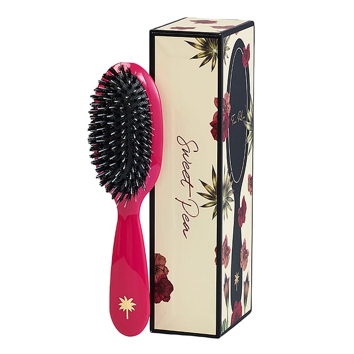 Fan Palms Blush -harjassa on villisian- ja nailonharjakset, jotka tuovat hiuksiin kiiltoa ja sileyttä. Nailonharjakset ovat pidemmät, jotta ne voivat hellävaraisesti stimuloida hiuspohjaa ja selvittää hiukset, kun taas villisianharjakset auttavat levittämään talia. Harja stimuloi verenkiertoa hiustuppeihin, ja useimmat huomaavat voivansa vähentää hiustenpesun tiheyttä joka kolmanteen tai neljänteen päivään. Toimitetaan kauniissa laatikossa, jossa on kultaisia yksityiskohtia.