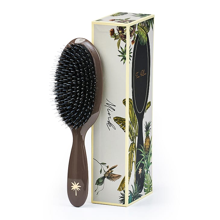 Fan Palms Blush -harjassa on villisian- ja nailonharjakset, jotka tuovat hiuksiin kiiltoa ja sileyttä. Nailonharjakset ovat pidemmät, jotta ne voivat hellävaraisesti stimuloida hiuspohjaa ja selvittää hiukset, kun taas villisianharjakset auttavat levittämään talia. Harja stimuloi verenkiertoa hiustuppeihin, ja useimmat huomaavat voivansa vähentää hiustenpesun tiheyttä joka kolmanteen tai neljänteen päivään. Toimitetaan kauniissa laatikossa, jossa on kultaisia yksityiskohtia.