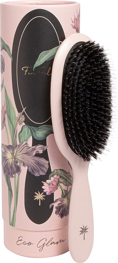 Fan Palms Blush -harjassa on villisian- ja nailonharjakset, jotka tuovat hiuksiin kiiltoa ja sileyttä. Nailonharjakset ovat pidemmät, jotta ne voivat hellävaraisesti stimuloida hiuspohjaa ja selvittää hiukset, kun taas villisianharjakset auttavat levittämään talia. Harja stimuloi verenkiertoa hiustuppeihin, ja useimmat huomaavat voivansa vähentää hiustenpesun tiheyttä joka kolmanteen tai neljänteen päivään. Toimitetaan kauniissa laatikossa, jossa on kultaisia yksityiskohtia.