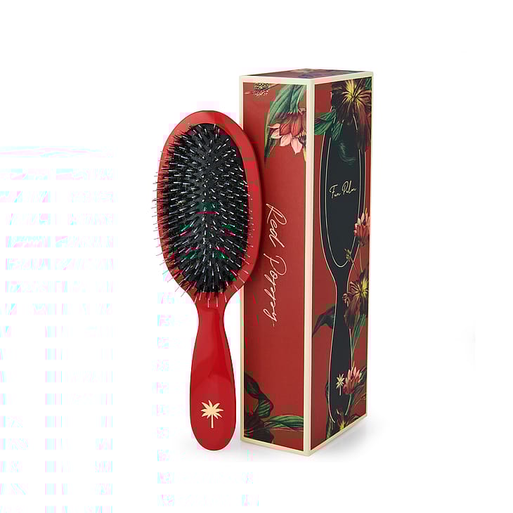 Fan Palms Blush -harjassa on villisian- ja nailonharjakset, jotka tuovat hiuksiin kiiltoa ja sileyttä. Nailonharjakset ovat pidemmät, jotta ne voivat hellävaraisesti stimuloida hiuspohjaa ja selvittää hiukset, kun taas villisianharjakset auttavat levittämään talia. Harja stimuloi verenkiertoa hiustuppeihin, ja useimmat huomaavat voivansa vähentää hiustenpesun tiheyttä joka kolmanteen tai neljänteen päivään. Toimitetaan kauniissa laatikossa, jossa on kultaisia yksityiskohtia.