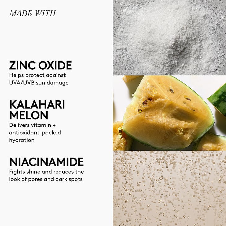 INACTIVE INGREDIENTS: WATER, C12-15 ALKYL BENZOATE, CAPRYLIC/CAPRIC TRIGLYCERIDE, BUTYLOCTYL SALICYLATE, DIMETHICONE, GLYCERIN, ETHYLHEXYL PALMITATE, PROPANEDIOL, BUTYROSPERMUM PARKII (SHEA) BUTTER, CARTHAMUS TINCTORIUS (SAFFLOWER) OLEOSOMES, GLYCERYL STEARATE SE, BUTYLENE GLYCOL, POLYHYDROXYSTEARIC ACID, SORBITAN ISOSTEARATE, CETYL ALCOHOL, NIACINAMIDE, PENTAERYTHRITYL TETRAISOSTEARATE, PHENYL TRIMETHICONE, SILICA, HYALURONIC ACID, SODIUM HYALURONATE, CITRULLUS LANATUS (WATERMELON) SEED EXTRACT, ADANSONIA DIGITATA PULP EXTRACT, BAROSMA BETULINA LEAF EXTRACT, ALOE BARBADENSIS LEAF JUICE, TOCOPHEROL, GLUCONOLACTONE, INULIN LAURYL CARBAMATE, HYDROXYETHYL ACRYLATE/SODIUM ACRYLOYLDIMETHYL TAURATE COPOLYMER, XANTHAN GUM, HYDROXYACETOPHENONE, POLYSILICONE-11, TRISODIUM ETHYLENEDIAMINE DISUCCINATE, SODIUM CITRATE, CITRIC ACID, BENZYL SALICYLATE, ETHYLHEXYLGLYCERIN, SODIUM BENZOATE, POTASSIUM SORBATE, PHENOXYETHANOL, FRAGRANCE, HEXYL CINNAMAL, LIMONENE, LINALOOL, YELLOW 6, RED 33.