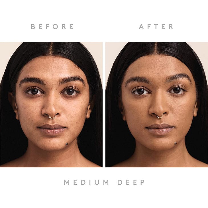 Parhaimman lopputuloksen saamiseksi valmistele iho Fenty Skin Hydra Vizor SPF 30 kosteusvoiteella ja Pro Filtr Instant Retouch Primerilla ennen meikivoiteen levitystä. Sekoita hyvin väripigmenttien aktivoimiseksi. Täyden peittävyyden meikkiin pumppaa 1-2 kertaa kämmenselälle. Taputtele tuotetta Full-Bodied 110 meikkivodesiveltimellä keskelle kasvoja ja häivytä ulospäin. Keskipeittävään meikkiin pumppaa 1 kerta kämmenselälle. Painele tuotetta kostealla Precision 100 meikkisienellä kohtiin joihin haluat peittävyyttä ja häivytä ulospäin. Rihannan vinkki: Äärimmäiseen huokosten peittämiseen painele tuotetta