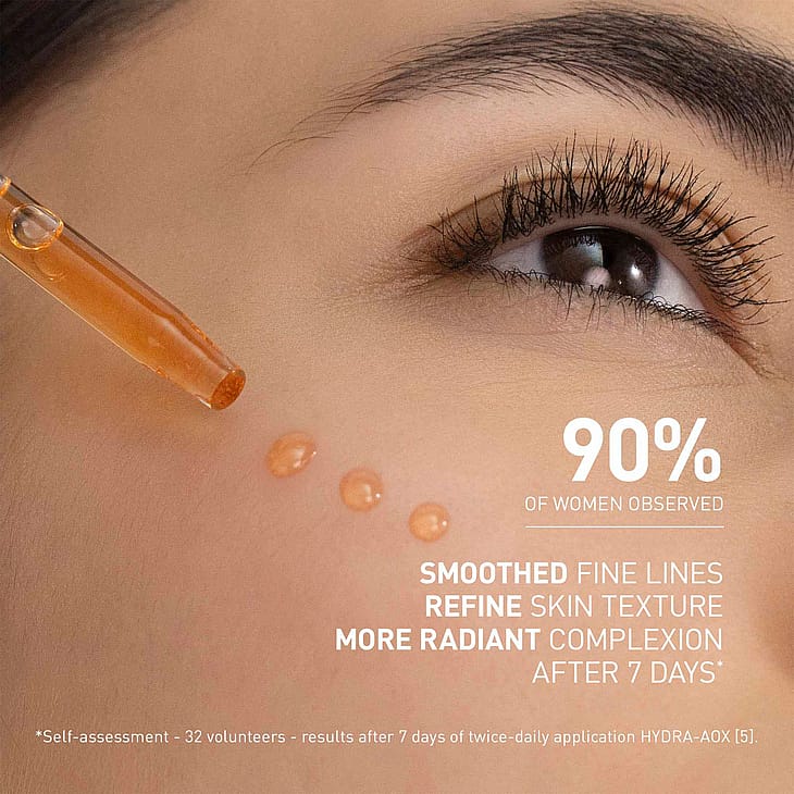 Hydra-AOX [5] on intensiivinen antioksidanttiseerumi, joka vaikuttaa juonteisiin ja epätasaiseen ihon rakenteeseen. Viittä antioksidanttia (astaksantiini + ergotioneiini + C-vitamiini + E-vitamiini + B3-vitamiini) ja hyaluronihappoa sisältävä tehokas koostumus suojaa ihoa ulkoisten rasitustekijöiden* aiheuttamalta ikääntymiseltä sekä korjaa jo olemassa olevia ikääntymisen merkkejä. Rypyt silottuvat, ihon rakenteesta tulee sileämpi ja iho saa uudistunutta hehkua. Kevyt, luonnollisen oranssin sävyinen koostumus. Testattu ihotautilääkärin valvonnassa.