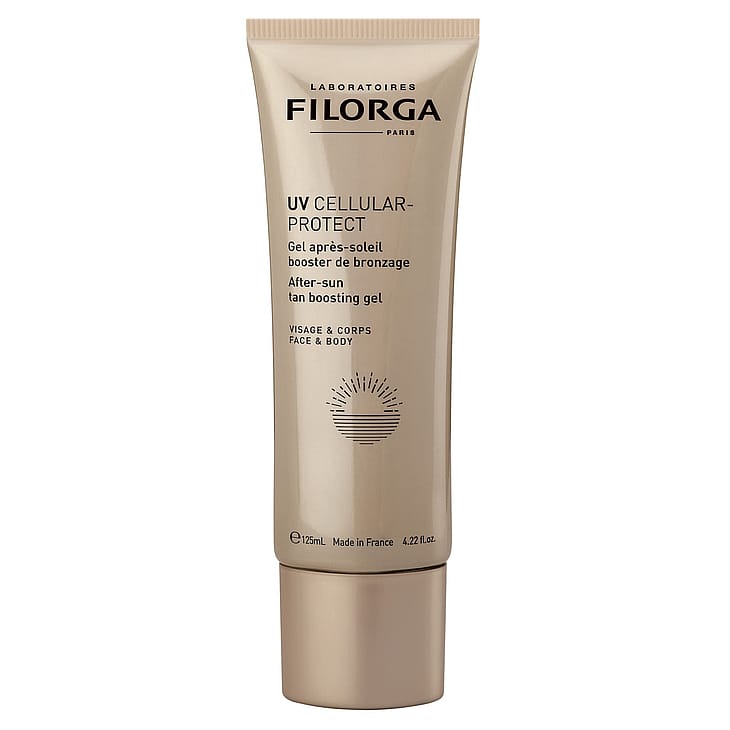 FILORGA UV Cellular-Protect After Sun on virkistävä aftersun-geeli, joka rauhoittaa ja kosteuttaa ihoa, vahvistaa päivetystä ja antaa intensiivistä hehkua. Koostumus sisältää FILORGA-laboratorioiden kehittämän NCEF 2.0 -yhdistelmän, joka edistää solujen uusiutumista. Kaksitehoinen koostumus sekä aktivoi että edistää ihon luonnollista melaniinintuotantoa antaen kauniin, intensiivisen päivetyksen. Kliinisissä testeissä on saatu vaikuttavia tuloksia: 96 % koki, että päivetys vahvistui* ja 90 % koki, että ihosta tuli kauniimpi ja päivetyksestä intensiivisempi**. Aminohappoja sisältävä koostumus antaa iholle rauhoittavan vaikutuksen. Aurinkosuojatuotteen geelikoostumus on tahmaamaton ja se antaa välittömästi raikastavan ja viilentävän tunteen. Koostumus ei sisällä UV-suodatinta eikä itseruskettavaa. Ei suojaa auringonpolttamilta. Parabeeniton koostumus, josta 91 % on luonnollista alkuperää.