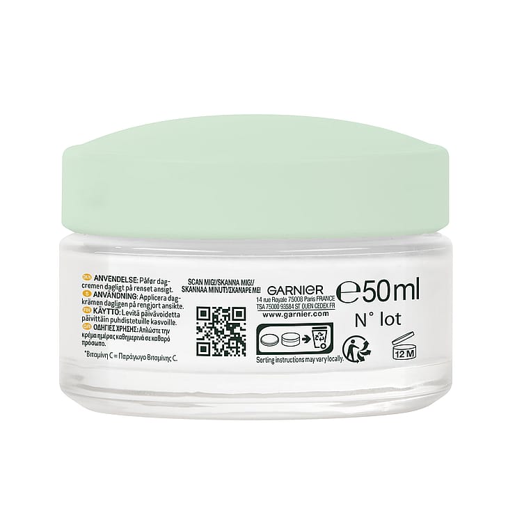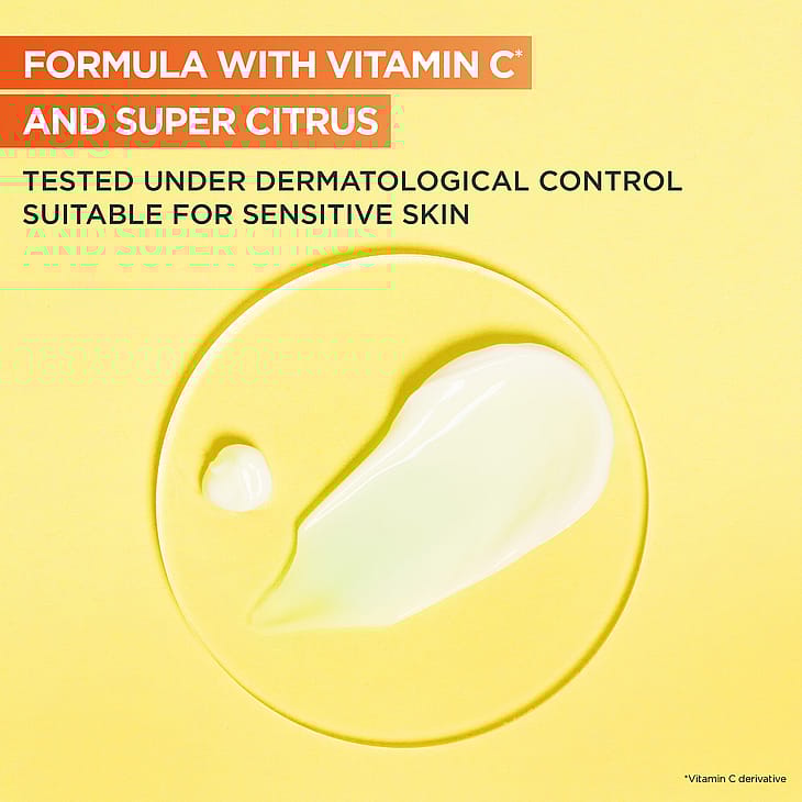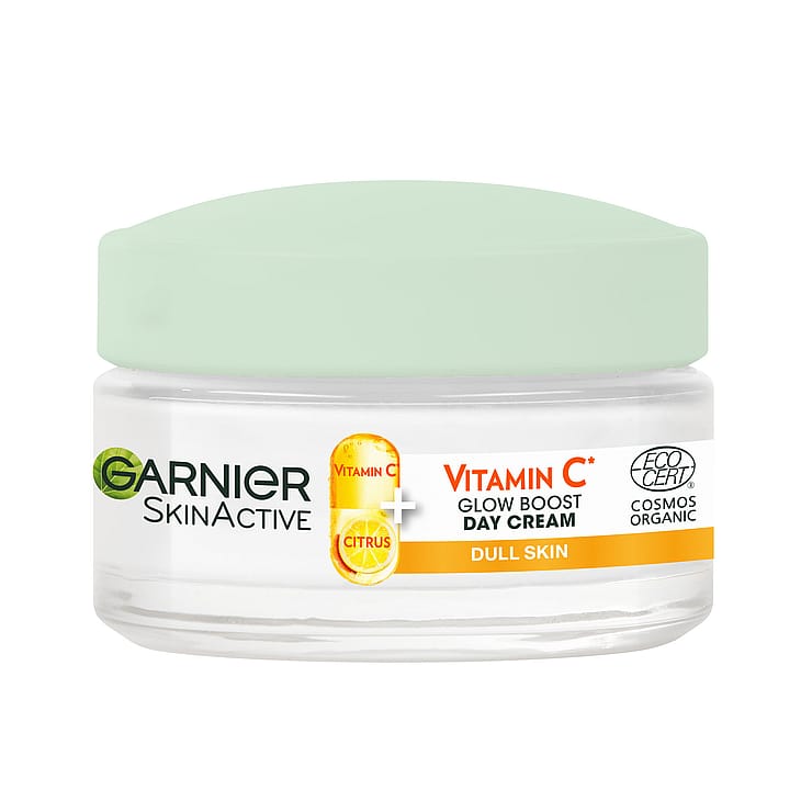 Garnier SkinActive Vitamin C Day Cream on luomusertifioitu kosteuttava päivävoide, jonka koostumus sisältää tiivistettyä C-vitamiinia* ja super sitrusta. Sen koostumus saa ihon näyttämään ravitulta, sileämmältä ja heleämmältä päivästä toiseen! Päivävoiteella on vegaaninen koostumus**. Testattu ihotautilääkärien valvonnassa. Sopii herkälle iholle.***. Garnier SkinActive Vitamin C Day Cream -päivävoiteen dokumentoitu vaikutus: 1 käyttökerran jälkeen: Iho on kosteutettu 24 tunnin ajan**** ja tuntuu kiinteämmältä. 14 päivän käytön jälkeen: Iho vaikuttaa sileämmältä ja heleämmältä ja tuntuu kiinteytyneeltä*****. 28 päivän käytön jälkeen: Juonteet ovat vähentyneet******.