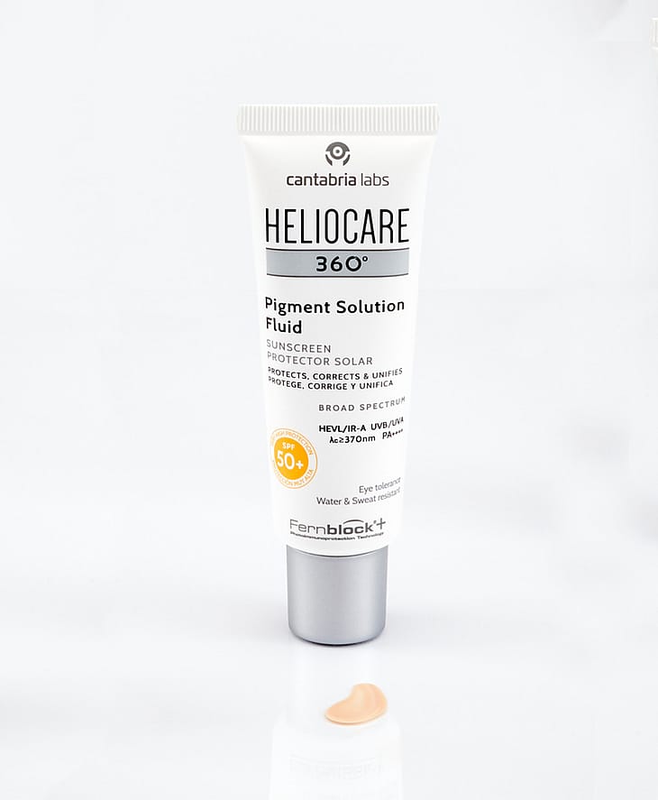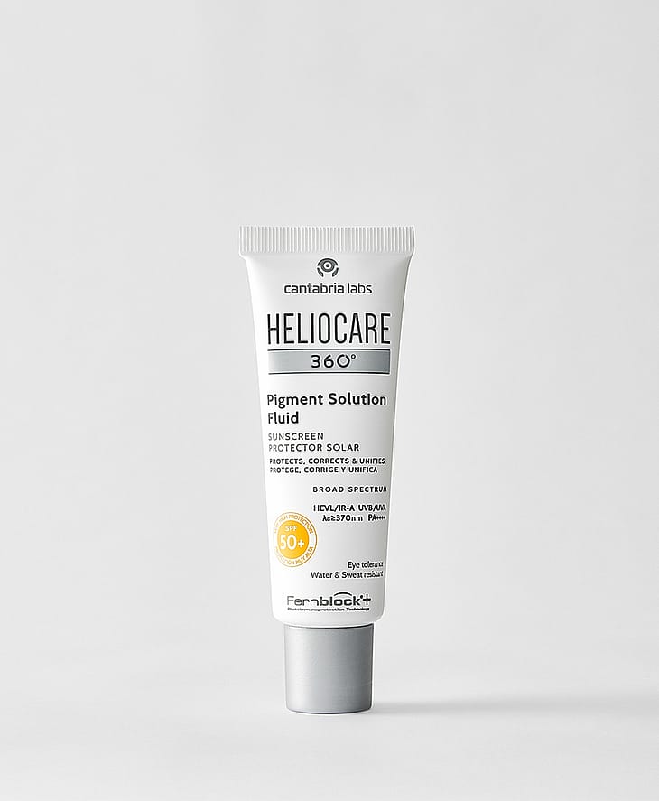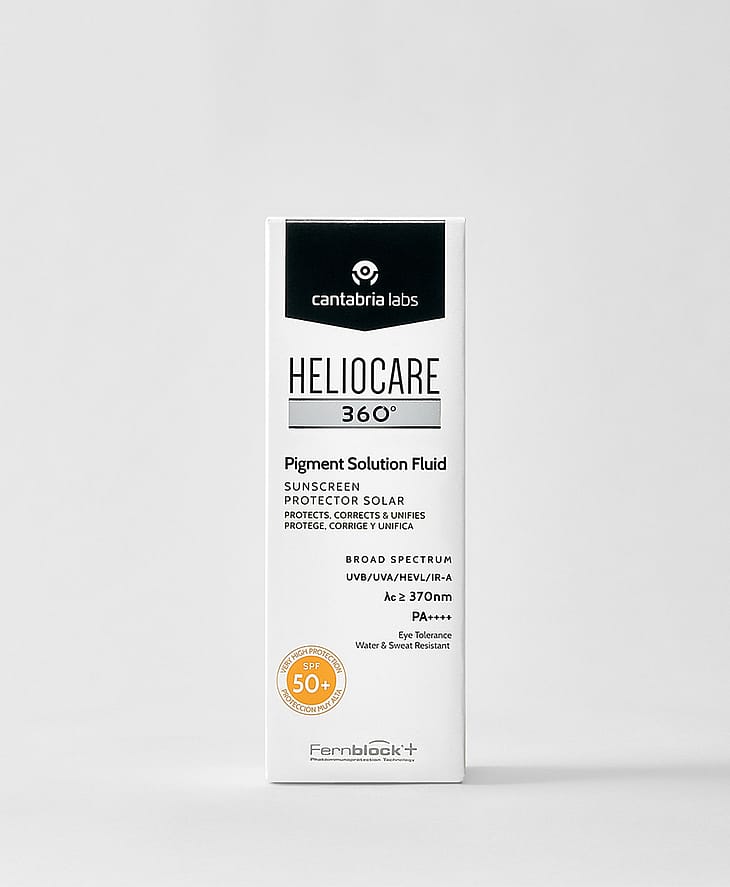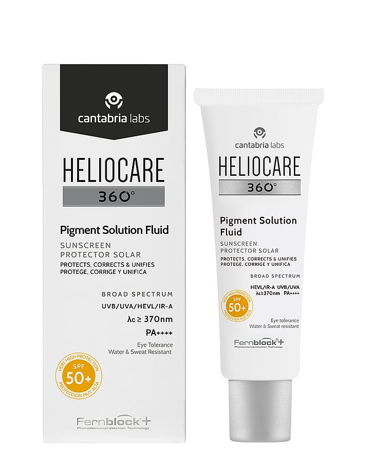 360 º Pigment Solution Fluid SPF50 on laajakirjoinen aurinkosuojavoide suojakertoimella 50. Se ennaltaehkäisee ja hoitaa hyperpigmentaatiota sekä epätasaista ihonsävyä. Tuote sisältää raaka-ainetta Fernblock - saniaisten uutteeseen perustuvaa yhdistettä, joka korjaa ja suojaa UVA- ja UVB-säteilyltä sekä siniseltä ja infrapunavalolta. Lisäksi se sisältää niasiiniamidia, rautaoksidia ja 'ellagic acid' -ainesosaa, joka estää uusien pigmenttimuutosten muodostumista. Niasiiniamidi tasoittaa olemassa olevia pigmenttimuutoksia, ja auttaa saavuttamaan tasaisemman ja kirkkaamman sävyisen ihon. Anti pollution -yhdiste, antioksidantit ja entsyymit korjaavat oksidatiivisia vaurioita. Tuote soveltuu kaikille ihotyypeille, sekä myös herkälle iholle. Laajakirjoinen aurinkojuoja suojakertoimella SPF50. Ennaltaehkäisee ja hoitaa pigmenttimuutoksia. Soveltuu kaikille ihotyypeille, sekä myös herkälle iholle.