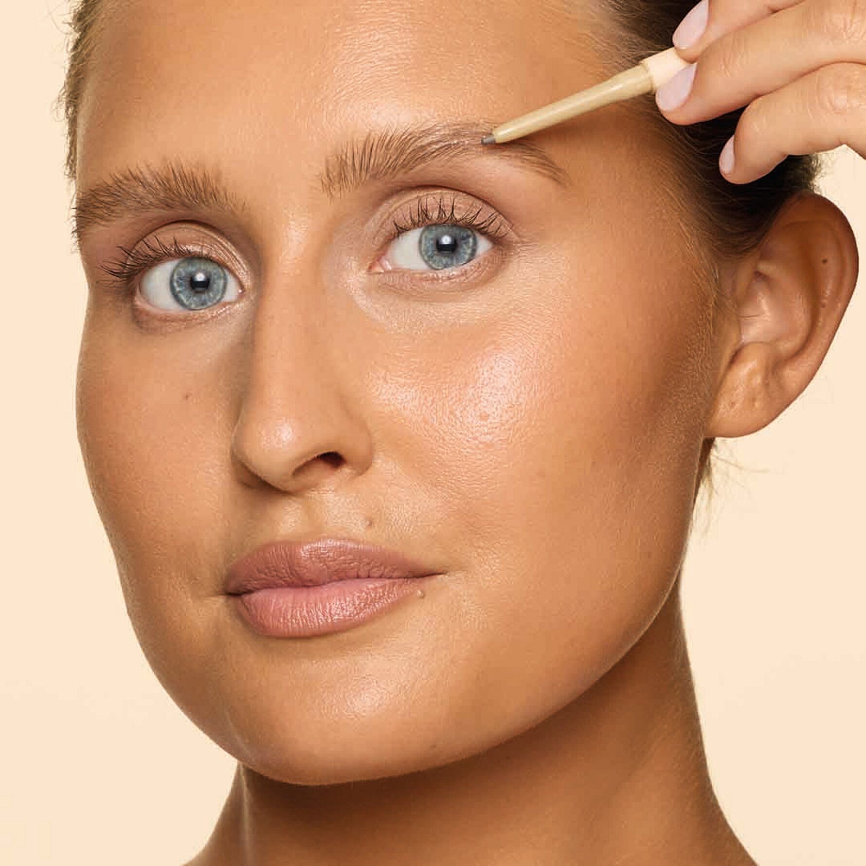 Harjaa kulmat ylöspäin ja käytä kermaista kynää täyttääksesi karvattomat kohdat lyhyillä vedoilla karvojen suuntaan. Käytä sitten kynän toista päätä vetääksesi hiustyyppisiä raitoja luodaksesi aidon vaikutelman. Ohuella nestemäisellä tussikärjellä intensiivistät vaikutusta ja luot epätasaisen luonnollisen lopputuloksen.