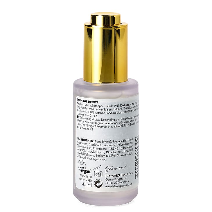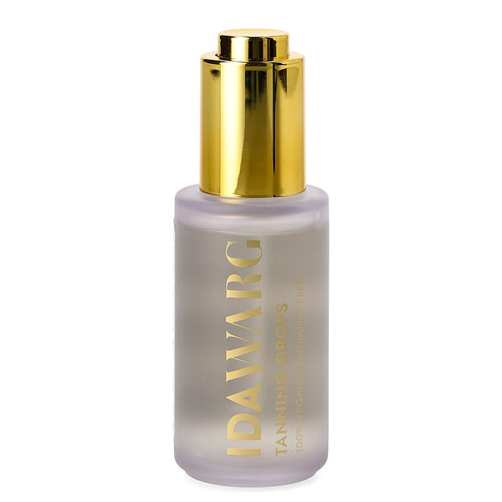 Itseruskettavat Ida Warg Tanning Drops -tipat on helppo sekoittaa yö- tai päivävoiteeseen luomaan iholle asteittaisen päivetyksen. Voit vaikuttaa lopputuloksen voimakkuuteen annostelemalla kasvovoiteeseen haluamasi määrä tippoja. Täysin vegaaninen.