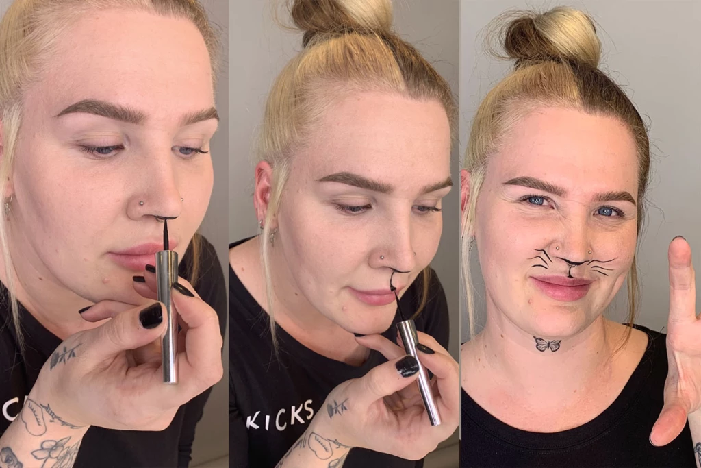 Viikset ja kuono sopivat hyvin meikiksi, jos pukeudut kissaksi tai lepakoksi tai jos haluat meikata kasvoillesi hauskan halloween-ilmeen. Näin teet kaikkein helpoimman ja kevyimmän halloween-meikin.