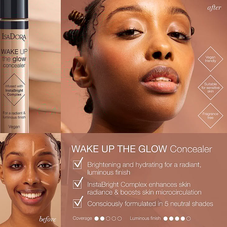 - InstaBright (3 %) – viisi hyötyä yhdessä: edistää ihon mikroverenkiertoa, ehkäisee latteutta, parantaa ihonsävyä, edistää ihon hehkua ja tasoittaa ihon pintaa. Jotta Wake Up the Glow Concealer -peitevoiteesi sävy on varmasti oikea, valitse ensin Wake Up the Glow Foundation -meikkivoiteesi. Valitse sitten samannumeroinen peitevoide — varmistimme, että sävy on hieman vaaleampi, jotta saat aikaan täydellisen kirkastavan vaikutuksen.