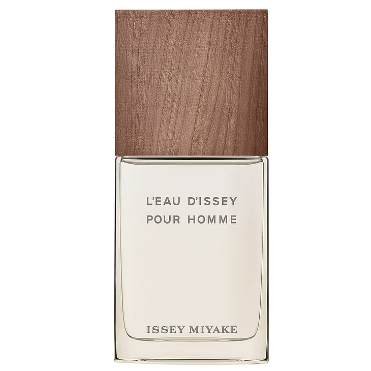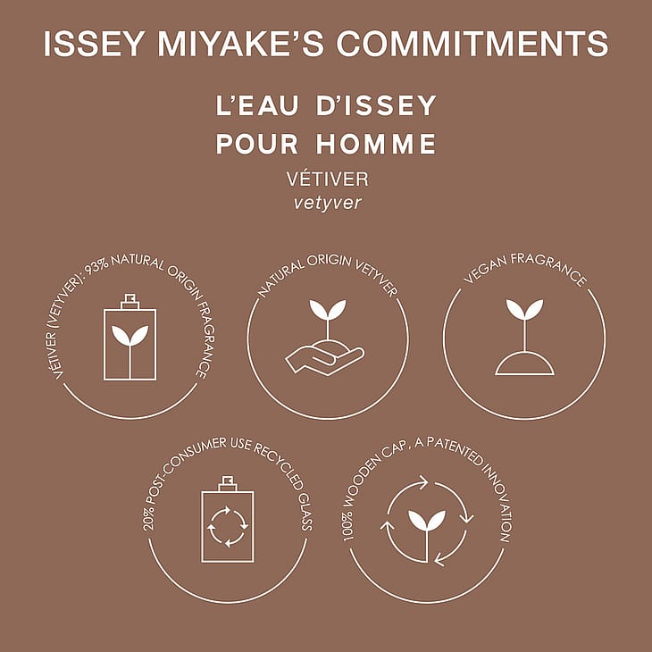 L'Eau d'Issey pour Homme Vétiverillä Issey Miyake tarjoaa uuden tulkinnan ikonisesta parfyymipullosta antamalla sille ruskean vetiverin juurta muistuttavan sävyn. Hienostunut lasinen parfyymipullo luo vastakohdan ruskealle korkille, joka symbolisoi veden ehdottoman puhtauden ja puun aistikkaan ja aidon luonnon kohtaamista.