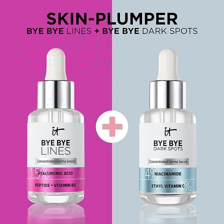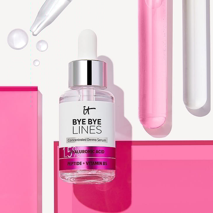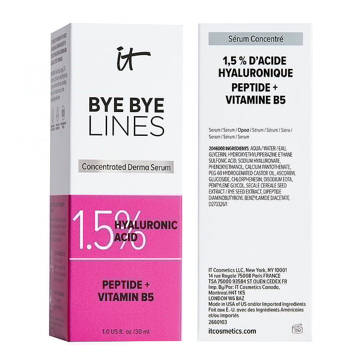 IT Cosmetics Bye Bye Lines Concentrated Derma Serum auttaa tekemään ihosta näkyvästi täyteläisemmän ja silottaa juoneita! Tämä kosmetokliinisesti testattu, dermatologisesti hyväksytty seerumi sisältää 1,5 % hyaluronihappoa, joka kosteuttaa pitkäkestoisesti. Lisäksi peptidin ja B5-vitamiinin yhdistelmä auttaa tekemään ihosta joustavan tuntuisen. Hyaluronihapposeerumi on kehitetty yhteistyössä plastiikkakirurgien ja ihotautilääkärien kanssa ja sopii kaikille ihotyypeille – myös herkälle iholle. Näkyvästi täyteläisempi ja sileämpi iho on täällä!