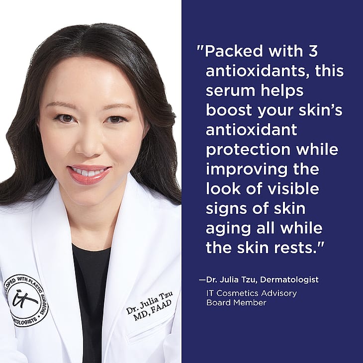 Tutustu IT Skincare with Confidence in Your Beauty Sleep Serum -yöseerumiin, joka on IT Cosmeticsin kiinteyttävä ja kirkastava seerumi. Antioksidanttiseerumi vaikuttaa iholla yön aikana, kun ihon korjaantumis- ja imeytymiskyky ovat tehokkaimmillaan. Seerumi: - 24 tunnin kosteutus - Vahvistaa ihon suojamuuria - Auttaa taistelemaan ihon ikääntymisen merkkejä vastaan. - Antaa näkyvää hehkua yön aikana ja vähentää hienoja juonteita ja ryppyjä. - Auttaa tekemään ihostasi nuorekkaamman-, hehkuvamman-, sileämmän - ja täyteläisemmän näköisen jo neljässä viikossa*. Patentoitu, kolminkertainen antioksidanttiyhdistelmä sisältää 12 % C-vitamiinia, 1,5 % ferulahappoa ja 0,5 % polydatiinia. Erittäin tiivistetty koostumus tehostaa ihon luontaista korjaantumisprosessia nukkuessasi. Kehitetty yhteistyössä ihotautilääkärien ja plastiikkakirurgien kanssa. Koostumus on kehitetty erityisesti heleyttämään ihoa yön aikana ja taistelemaan ihon ikääntymisen merkkejä vastaan. *Perustuu kliiniseen arviointiin, johon osallistui 81 naista neljän viikon aikana ja 8 viikkoa kestävässä kliinisessä tutkimuksessa. Tripla-antioksidanttikonsentraatti, jossa on patentoitu yhdistelmä: - 12 % C-vitamiinia - 1,5 % ferulahappoa - 0,5% polydatiinia.