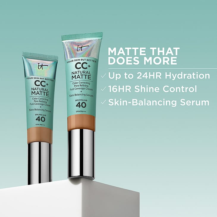 Rasvoittuva iho? Loihdi ihosta mattapintainen CC+ Cream Natural Matte meikkivoiteella – kiiltoa vähentävä, täysin peittävä meikkivoide sekä ihoa tasapainottava seerumi ja suojakerroin SPF40 samassa tuotteessa.