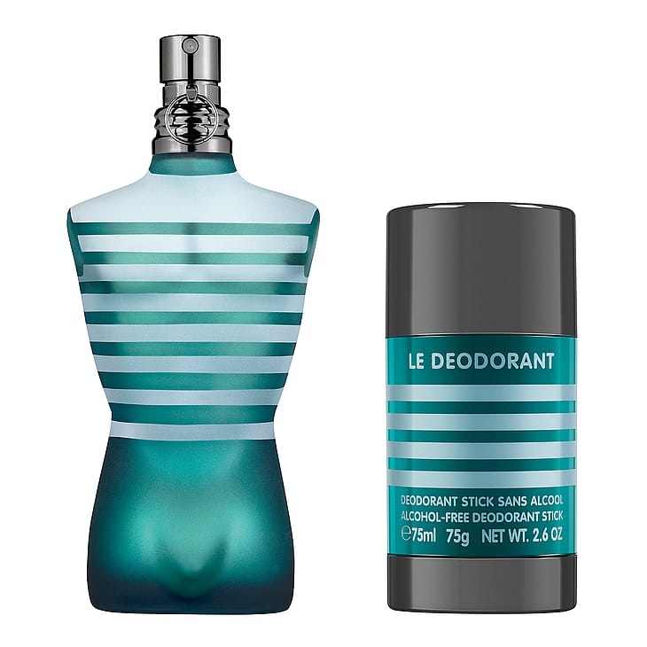 Le Male EDT: AQUA (WATER), ALCOHOL DENAT., METHYL GLUCETH-20, PEG-40 HYDROGENATED CASTOR OIL, PARFUM (FRAGRANCE), GLYCERIN, ALOE BARBADENSIS LEAF JUICE, ACRYLATES/C10-30 ALKYL ACRYLATE CROSSPOLYMER, TRIETHANOLAMINE, GLYCERYL POLYACRYLATE, ALLANTOIN, LINALOOL, LIMONENE, GERANIOL, MENTHOL, CITRONELLOL, HYDROXYCITRONELLAL, BENZYL SALICYLATE, HEXYL CINNAMAL, COUMARIN, CITRAL, CITRIC ACID, POTASSIUM SORBATE, CI 42090 (BLUE 1), CI 17200 (RED 33)Le Male deo stick: BUTYLENE GLYCOL, PROPYLENE GLYCOL, AQUA (WATER), SODIUM STEARATE, POLOXAMER 188, SORBITOL, PARFUM (FRAGRANCE), ETHYLHEXYLGLYCERIN, CAPRYLYL GLYCOL, COUMARIN, SODIUM HYDROXIDE, TETRASODIUM EDTA, ALPHA-ISOMETHYL IONONE, LIMONENE, LINALOOL, CITRAL, CINNAMAL, EUGENOL, GERANIOL, CI 60730 (EXT. VIOLET 2).
