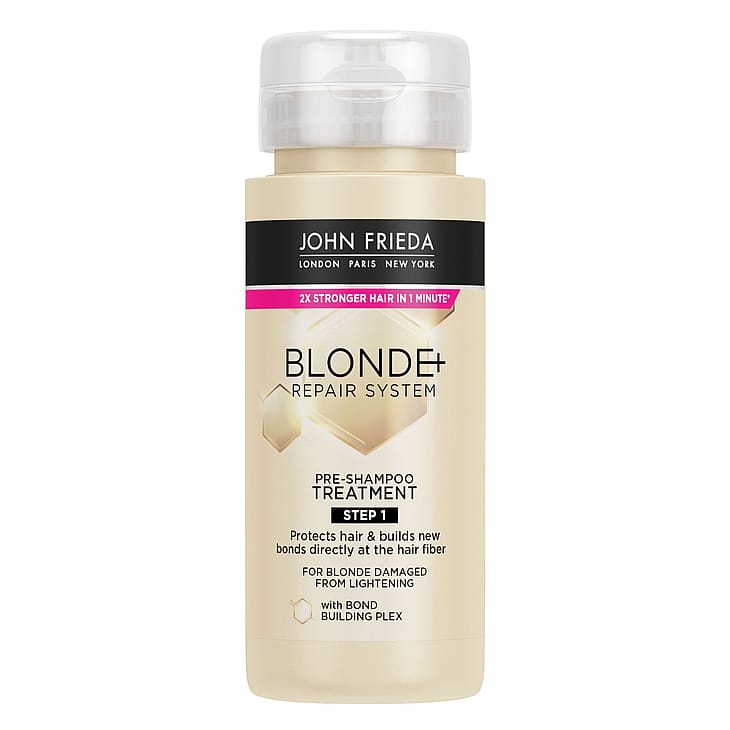 Saavuta paras blondiversio ilman kompromisseja ja ilman riskiä vahingoittaa hiuksiasi. Blonde+ Repair Pre-Shampoo Treatment on sarjan 3-vaiheisen järjestelmän ensimmäinen vaihe, joka auttaa korjaamaan värjäyksen, vaalennuksen ja lämpökäsittelyn aiheuttamia vaurioita. Tämä on John Friedan vahvin blondisarja tähän mennessä. Jättää hiukset kaksi kertaa vahvemmiksi ja kaksi kertaa kiiltävämmiksi jo yhden pesun jälkeen. KAVALUUS: Luotu erityisesti vaalennetuille hiuksille, jotka ovat vaurioituneet vaalennuksesta/värjäyksestä. Blonde+ Repair Bond Building Shampoo on patentoidun Bond Building Plex -teknologian sisältävä shampoo, joka korjaa, vahvistaa ja ravitsee hiuksia sekä suojaa niitä tulevilta vaurioilta. Kun käytät Blonde+ Repair Pre-Shampoo Treatment, Bond Building Shampoo ja Bond Building Conditioner -tuotteita vaiheittain yhdessä, huomaat selvästi kiiltävämmän ja korjatun blondin hiuksen jo yhden pesun jälkeen. Tämä Repair Pre-Shampoo Treatment auttaa palauttamaan terveemmän blondin hiuksen. Se vakauttaa ja valmistaa hiukset rakentamaan uusia hydrosideja suoraan hiusten kuidun ympärille vahvistaen ja suojaten niitä tulevilta vaurioilta. Vegaaninen.