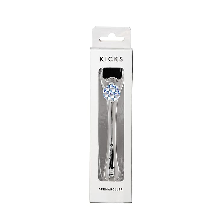 KICKS Derma Roller koostuu 540 mikroneulasta (0,2 mm), jotka tekevät ihoon hellävaraisesti satoja mikroskooppisen pieniä reikiä. Työkalu stimuloi ihoa ja tehostaa kollageenin tuotantoa. Käytön jälkeen iho tuntuu pehmeämmältä ja kiinteämmältä ja sen sävy on tasaisempi.