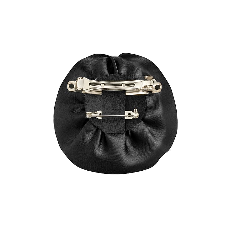 Tyylikäs musta kangaskukka, jossa on sekä hiussolki että neula. Kukka sopii täydellisesti pieneksi koristeeksi hiuksiin tai tyylikkääksi asusteeksi vaatteeseen tai laukkuun.