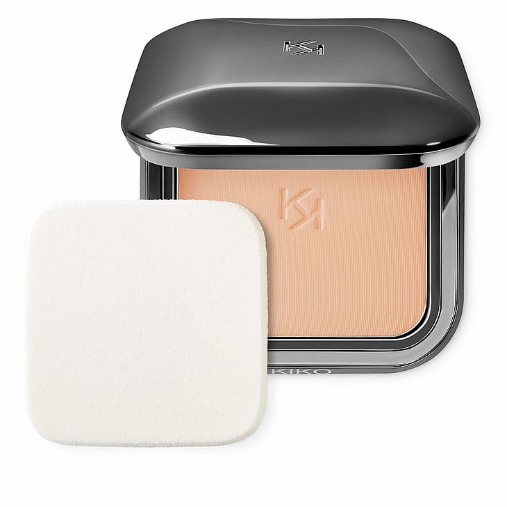 Smoothing pressed powder foundation with a matte finish and SPF 30 is ideal for normal to oily skin. The enriched formula contains pomegranate extracts. The enveloping, supple texture evens out the complexion for a flawless, natural look. The foundation glides on easily and is buildable. The product’s sunscreens protect the skin. This innovative pressed powder foundation can be used two ways: wet or dry. The foundation comes in a modern, elegant compact that’s highly practical. The gunmetal finish with the KK logo engraved on the cover is one of a kind. The compact contains foundation, a sponge and its holder, a magnetic closure and a large internal mirror. Dermatologically tested. Non-comedogenic.