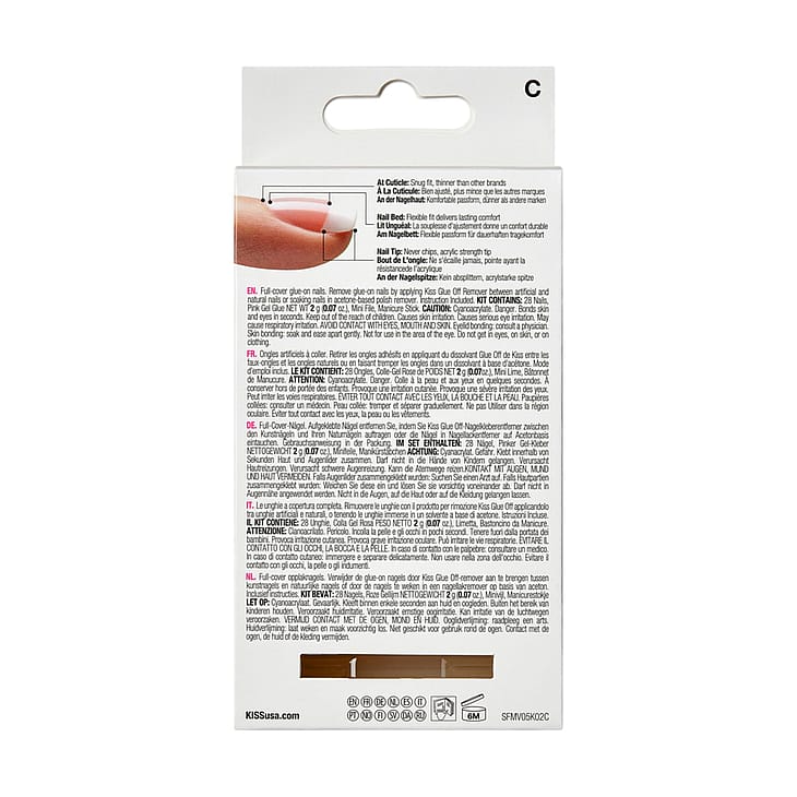 Puhdista kynnet kynsilakanpoistoaineella ja pese kätesi huolellisesti saippualla. Valitse jokaiselle sormelle oikean kokoinen kynsi ja aseta se sivuun. Levitä liimaa tekokynnen takaosaan. Levitä liimaa luonnollisiin kynsiin. kiinnitä kynsinauhoilla, paina kevyesti ja pidä 5 sekuntia. Asiantuntijan vinkki: Levitä riittävästi liimaa, jotta vältyt ilmataskuilta, varmistat kiinnittymisen ja pidennät kulumista. POISTAMINEN: Leikkaa ja viilaa pinta. Käytä KISS Glue OFF -liimaa tai liota kynnet asetonikynsilakanpoistoaineessa, kunnes ne ovat pehmeitä. Pyyhi kynsi ja liima pois. Älä pakota tai vedä nauloja pois.