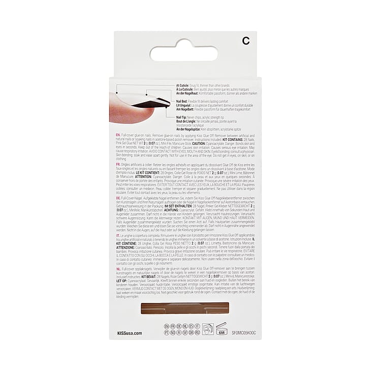 Puhdista kynnet kynsilakanpoistoaineella ja pese kätesi huolellisesti saippualla. Valitse jokaiselle sormelle oikean kokoinen kynsi ja aseta se sivuun. Levitä liimaa tekokynnen takaosaan. Levitä liimaa luonnollisiin kynsiin. kiinnitä kynsinauhoilla, paina kevyesti ja pidä 5 sekuntia. Asiantuntijan vinkki: Levitä riittävästi liimaa, jotta vältyt ilmataskuilta, varmistat kiinnittymisen ja pidennät kulumista. POISTAMINEN: Leikkaa ja viilaa pinta. Käytä KISS Glue OFF -liimaa tai liota kynnet asetonikynsilakanpoistoaineessa, kunnes ne ovat pehmeitä. Pyyhi kynsi ja liima pois. Älä pakota tai vedä nauloja pois.