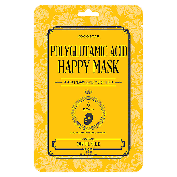 Polyglutamic Acid Happy Mask on tehokosteuttava naamio kaikille ihotyypeille, erityisesti kuivalle ja kosteusköyhälle iholle. Koostumus sisältää polyglutamiinihappoa - fermentoiduista soijapavuista tuotettua peptidiä - sekä kuutta erilaista hyaluronihappoa ja manteliöljyä, jotka toimivat yhdessä lukitsemalla kosteuden ihoon pitkäkestoisesti, jolloin iho näyttää välittömästi sileämmältä ja tuntuu joustavammalta. Kasviperäinen kollageeniuute antaa iholle vielä lisää kosteutta ja täyteläisyyttä. Naamio on valmistettu 100% ympäristöystävällisestä, luonnollisesta ruskeasta puuvillasta, joka asettuu kasvoille hyvin.