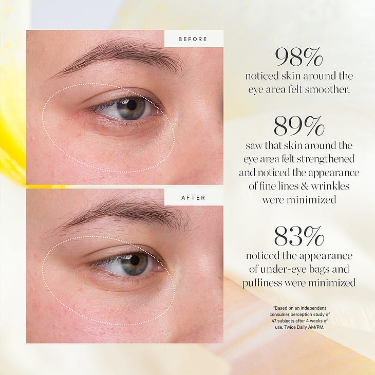 Tämä samettinen silmänympärysvoide käyttää 5,5-prosenttista aktiivista C-vitamiinisekoitusta superhedelmistä Kakadu Plum + Cloudberry sekä hellävaraista mutta tehokasta askorbyyliglukosidia kirkastamaan silmänympärysihoa, kun taas vitamiinipitoiset kasviperäiset aineet ja peptidit hoitavat juonteita, ryppyjä ja kiinteyttä säteilevämmän ja nuorekkaamman näköisen ihon saavuttamiseksi.