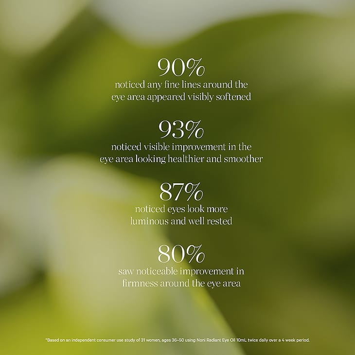 * Perustuu riippumattomaan kuluttajakäyttötutkimukseen, jossa 31 36-50-vuotiasta naista käytti Noni Radiant Eye Oil 10 ml:aa kahdesti päivässä 4 viikon ajan.