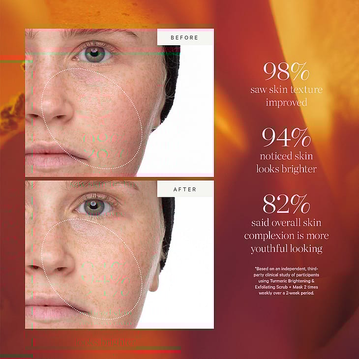 * Perustuu riippumattomaan, kolmannen osapuolen kliiniseen tutkimukseen, jossa osallistujat käyttivät kurkumaa kirkastavaa ja kuorivaa naamiota 2 kertaa viikossa 2 viikon ajan.