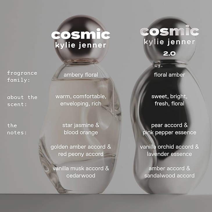 "Personifioi aamun olemus Cosmic Kylie Jenner 2.0 -tuoksulla. Ensimmäisellä suihkauksella kukkainen meripihkainen eau de parfum ympäröi sinut taivaallisella syleilyllä, jossa avautuvat makean päärynän ja raikkaan vaaleanpunaisen pippurin vivahteet. Tuoksun kehittyessä sydäntuoksut vaniljaorkidean soinnusta ja laventeli-essenssistä avautuvat kuin herkät terälehdet. Lämpöön ja sensuaalisuuteen ankkuroituna pohjatuoksut meripihkasta ja santelipuusta luovat kiehtovan auran, joka kestää koko päivän.
