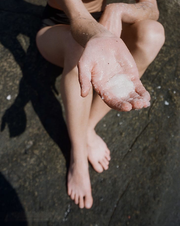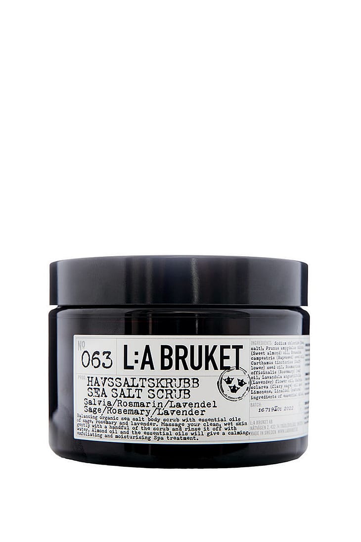 L:a Bruket 063 Sea Salt Scrub Salvia/Rosmary/Lavender on luonnollinen vartalokuorinta, joka sisältää runsaasti magnesiumia sisältävää suolaa ja manteliöljyä, joka kuorii ja kosteuttaa ihoa hellävaraisesti. Kuorinta vapauttaa ihon myrkkyistä, elvyttää kehoa ja sielua sekä auttaa stimuloimaan verenkiertoa, mikä edistää tervettä ihoa ja sileämmän koostumuksen. Sisältää runsaasti D-, E-vitamiinia, kivennäisaineita ja tärkeitä rasvahappoja, jotka vahvistavat ihoa, ehkäisevät tulehduksia, korjaavat vaurioita ja ehkäisevät tehokkaasti kuivumista.