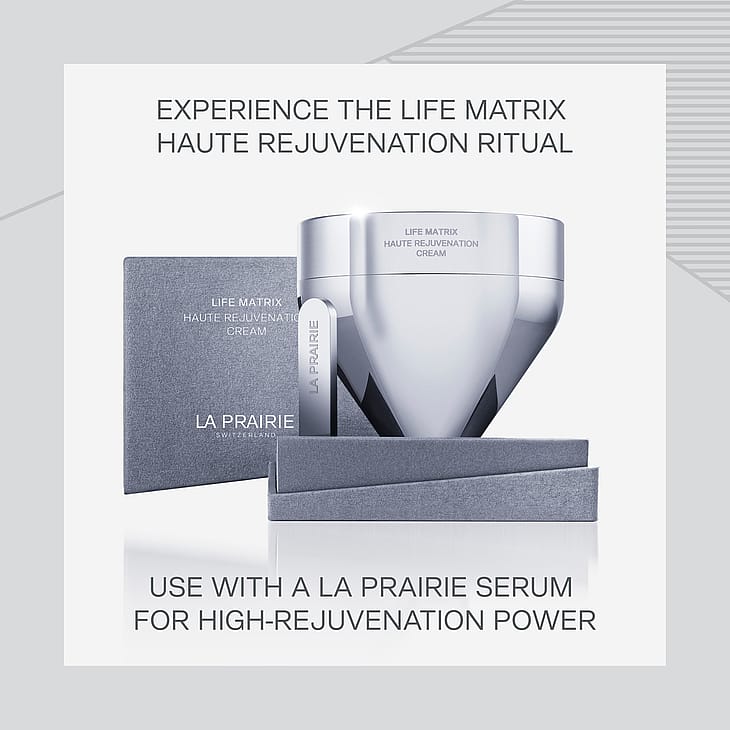 La Prairie esittelee uuden, pitkän tutkimustyön tuloksena kehitetyn voiteensa, joka hyödyntää High Longevity Science -osaamista: Life Matrix Haute Rejuvenation Face Cream. Sen tavoitteena on pidentää ihon elinvoimaisuutta palauttamalla yksilöllinen Cellular Information Matrix, laajentamalla solujen terveysikää ja tukemalla niiden kykyä toimia tehokkaasti pidempään. Voide vaikuttaa ikääntymisen perimmäisiin mekanismeihin, jotta iho säilyttäisi nuorekkaan ulkonäkönsä ja uudistuisi entistä vaikuttavammin.