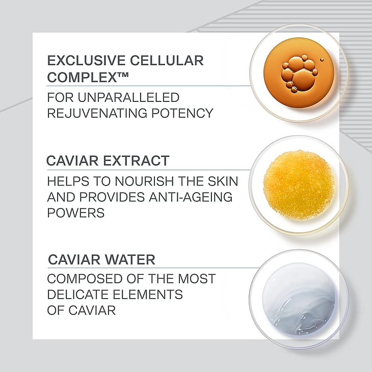 Caviar Water, Water (Aqua), Propanediol, Dimethicone, Glycoproteins*, Panax Ginseng Root Extract*, Equisetum Arvense Extract*, Caviar Extract, Lens Esculenta (Lentil) Seed Extract, Avena Sativa (Oat) Kernel Extract, Yeast Extract, Ergothioneine, Saccharide Isomerate, Saccharomyces Cerevisiae Extract, Amodimethicone, Sodium Citrate, Disodium EDTA, Acrylates/C10-30 Alkyl Acrylate Crosspolymer, Sodium Hydroxide, Citric Acid, Glycerin, Propylene Glycol, Sodium Salicylate, Lactobacillus Ferment, Pentylene Glycol, Polysorbate 80, Xanthan Gum, Dimethicone/Vinyl Dimethicone Crosspolymer, Carbomer, Fragrance (Parfum), Linalool, Citronellol, Geraniol, Limonene, Eugenol, Benzyl Benzoate, Benzyl Salicylate, Phenoxyethanol, Ethylhexylglycerin, Sodium Benzoate i71 * New patent pending for la prairie’s exclusive Cellular Complex in addition to US Patent 5, 840, 309