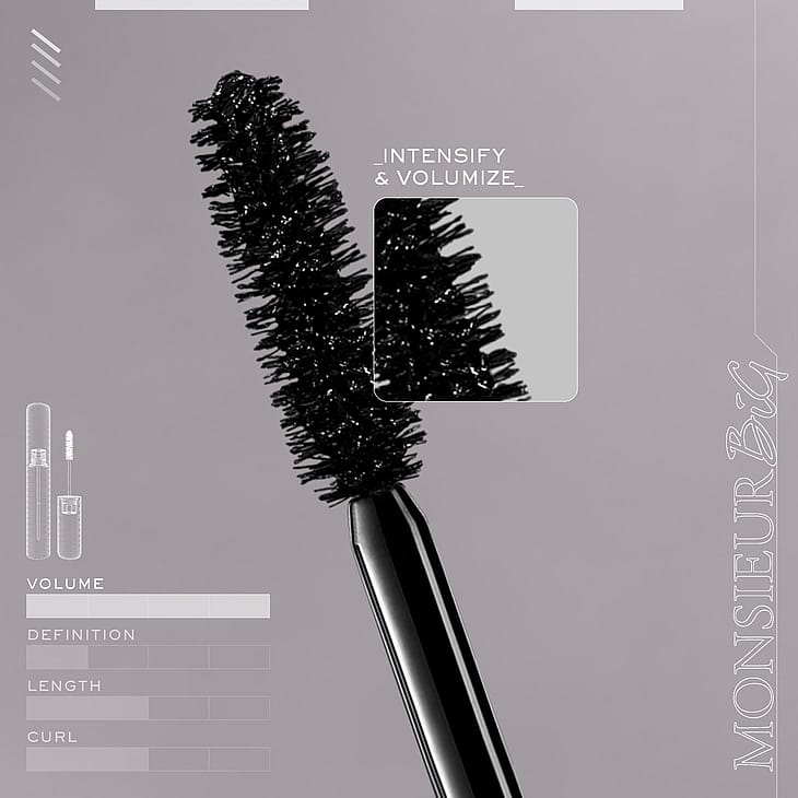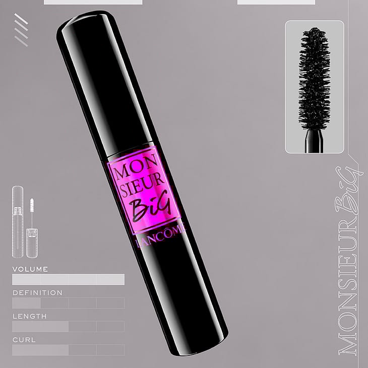 Lancôme Monsieur Big. Monsieur Big on isosti tuuheutta antava ja pitkäkestoinen maskara. Ripsivärissä on klassinen ripsiharja. Maskaraa voi kerrostaa entistä näyttävämmän lopputuloksen saamiseksi. Tällöin lisää ripsiväriä ripsiin, anna kuivua 7 sekuntia ja lisää uusi kerros maskaraa. Säänkestävä Ripsiväri on testattu silmälääkärien valvonnassa ja sopii herkille silmille.