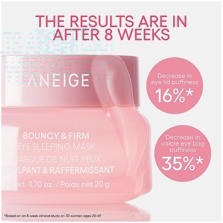 LANEIGE Bouncy & Firm Eye Sleeping Mask kosteuttaa silmänympärysihoa yön aikana ja tekee siitä kirkkaamman ja napakamman. Kevyt viilentävä geelikoostumus auttaa vähentämään turvotusta ja tummuutta. Peony-Collagen Complex, kofeiini ja niasiiniamidi tukevat kiinteyttä ja heleyttä. Peptidit sitovat kosteutta. Herää virkistynein ja tasaisemman näköisin silmänalusin.