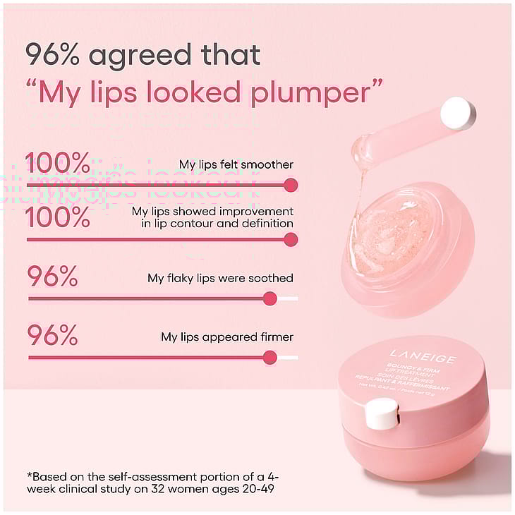LANEIGE Bouncy and Firm Lip Treatment tekee kuivista huulista näkyvästi täyteläisemmät ja kimmoisammat. Geelivoidemainen koostumus sitoo kosteutta ja ceramidikapselit tukevat huulten suojamuuria. Peony & Collagen Complex ja peptidit tuovat volyymia ja viisi erilaista hyaluronihappoa kosteuttaa tehokkaasti. Lopputuloksena kiiltävä, helmiäinen viimeistely.