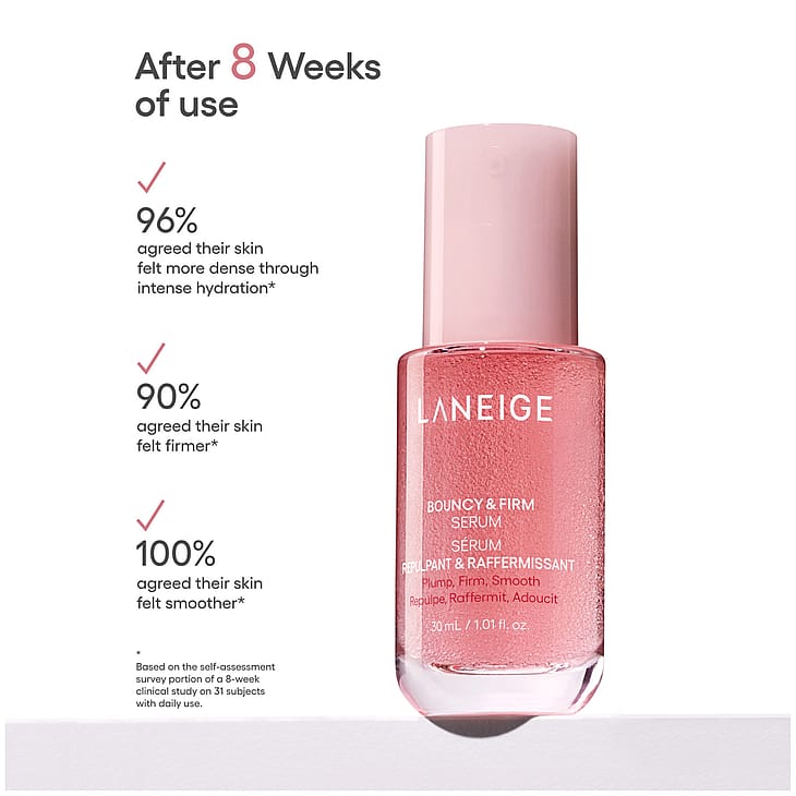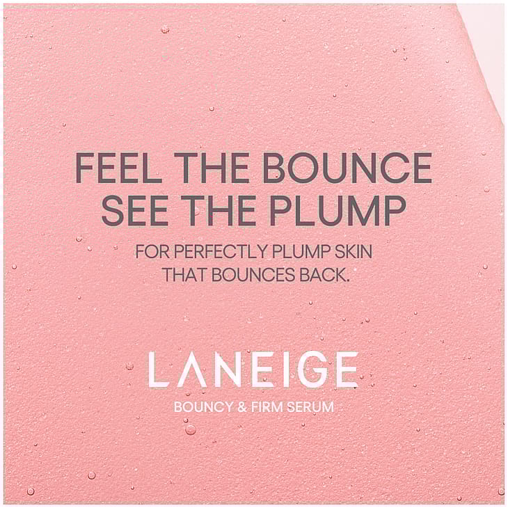 LANEIGE Bouncy & Firm Serum tekee ihosta kiinteämmän ja heleämmän näköisen. Kevyt koostumus torjuu ikääntymisen merkkejä peptidiveden, pionin, kollageenikompleksin ja niasiiniamidin avulla. SmoothTech-kapselit, joissa on C- ja E-vitamiinia, tukevat ihon kimmoisuutta, kirkastavat ja kosteuttavat tehokkaasti. Iho näyttää täyteläiseltä, raikkaalta ja tasaiselta.